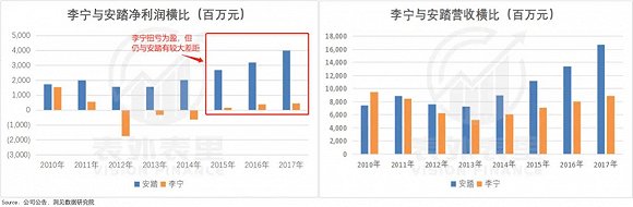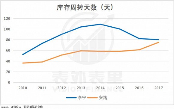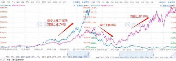 要知道,在2010年行业库存危机后,两者的股价却是相反的极端——李宁下跌80%,安踏上涨120%。