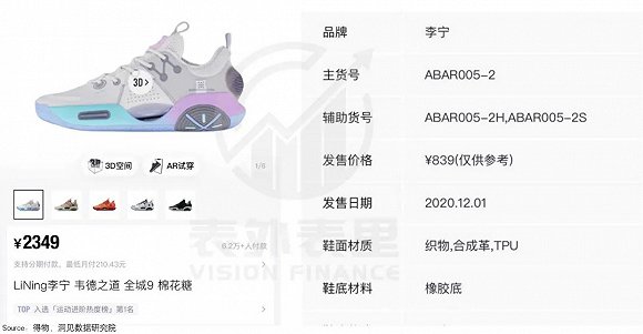 据我们调研,底气或许来自于不管怎么涨价,产品都好卖。如下图,韦德之道全城9球鞋,最近在得物上,从839元炒到了2349元,涨了近三倍,成交额仍有6万多。