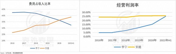 可以看到,2021H1,李宁的盈利水平追上了安踏。
