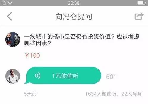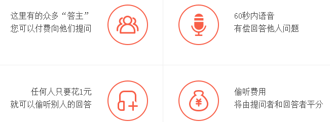 通过微信登录后,可以通过1元钱偷听别人提问的答案;也可以设置自己回答问题的价格,让别人付费收听;一旦问题被偷听,提问者可以获得0.5元。所有答案只有60秒。