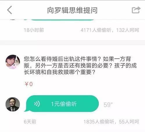 其次,回答没有权威性,甚至带来严重误导。罗振宇是从微信公众号诞生的网红,目前也入驻到“分答”。有女用户提问:您怎么看待婚后出轨这件事,如果一方背叛是否还有挽留的必要?孩子成长与自我救赎哪个重要?