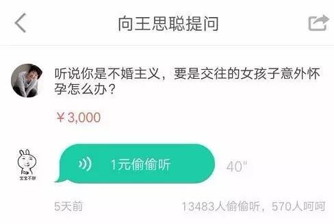 比如,有人问王思聪“听说你是不婚主义,要是交往的女孩子意外怀孕怎么办?”这条3000元的提问被13300多人花钱偷听。截止2016年6月2日晚间7点40,王思聪的收入已经高达22万余元。