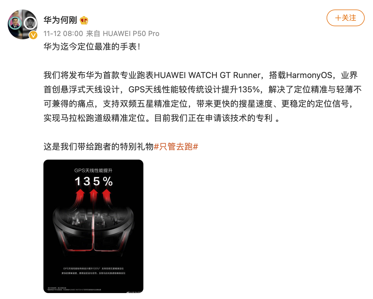 11月12日早间,华为消费者业务首席运营官何刚发布微博称,将发布华为首款专业跑表HUAWEI WATCH GT Runner,搭载HarmonyOS,“实现马拉松跑道级精准定位”。目前华为正在申请该技术的专利 。