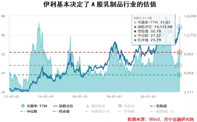 长期以来,A股中乳企的数量和市值占比都不大,伊利也基本算是“一枝独秀”。如果以“乳品指数(申万)”来作为乳制品行业资本市场的辅助参考,伊利股份在指数中的权重占比一直超过70%,个别时期甚至会达到90%。因此伊利股份的估值基本决定了乳品指数的估值,伊利股份股价的涨跌也基本决定了乳制品指数的涨跌。