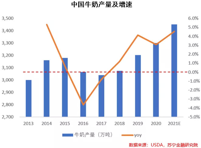 在需求端,2020年国内人均液态奶消费量约为24kg/人/年,而在饮食文化较为相似的韩国、日本则约为40kg/人/年,与之相比,国内未来人均液态奶消费量还有超过60%的提升空间,可以说是需求的前景十分广阔。