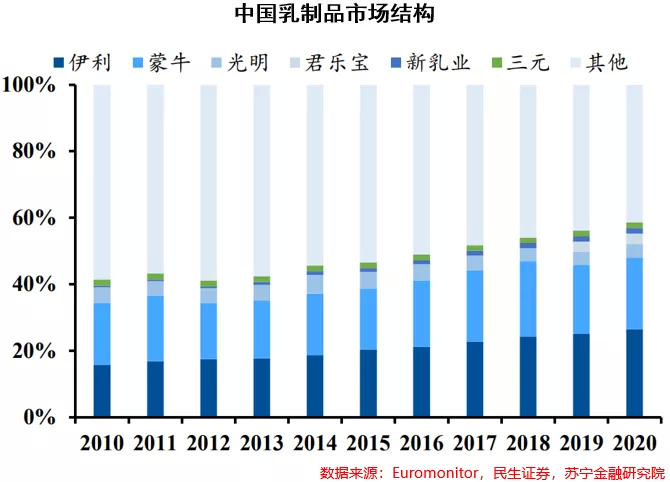 在强整顿和行业增速放缓的情况下,乳企数量从2008年的800多家降低至目前的500家左右,行业的集中度不断提升。蒙牛和伊利依靠在常温奶的扩张,取得行业领先的地位,市占率不断提升,形成了“双寡头”的市场竞争格局。到2020年,二者在常温奶的市占率合计超过60%,在整个乳制品市场中的市占率也将近50%。