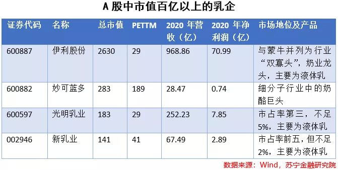 在主要的上市乳企中,除了妙可蓝多外,伊利、光明及新乳业主要产品均为市场空间和份额最大的液态奶。