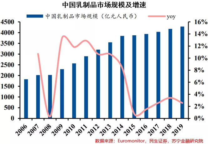 国内的乳制品市场相较于国外起步很晚,在1997年“利乐包装”(目前市场中较为常见的硬纸板、铝制等包装技术)进入中国后,常温奶才得以在全国推广。但在庞大的人口基数下,乳制品市场特别是其中的常温奶发展极快,目前已经是仅次于美国的世界第二大乳制品市场,市场规模超过4000亿元。无论是在居民的日常生活消费中,还是资本市场的投资中,乳制品都是一个具有十分重要地位的行业。