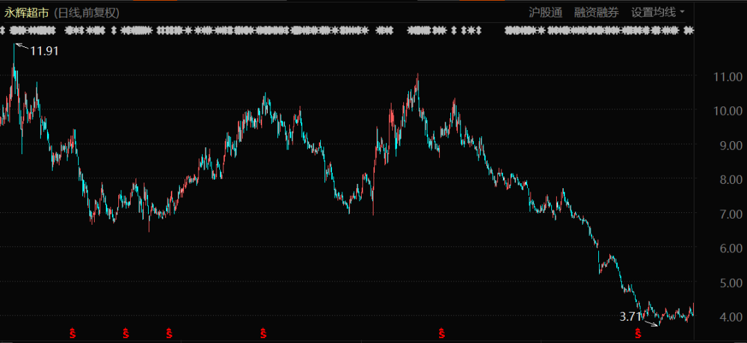 从股价上看,2018年商超龙头永辉超市(SH:601933)达到了自己的历史最高价,从此开始了漫长的市值打六折之路,目前已经跌至400亿元以下,并且业绩上也开始陷入亏损;
