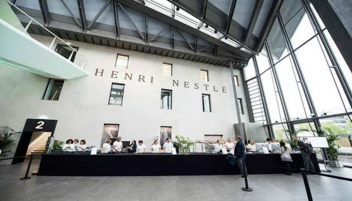 落地窗边的一面墙上印着雀巢创始人亨利·雀巢(Henri Nestle)的名字和他研制的婴儿食品Farine Lactee。