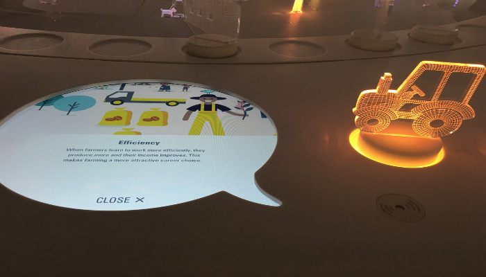 现在我们上楼,来到一个白色的房间,坐下来、从转动的环形轨道上选一个牌子,它会告诉你雀巢对不同关联体产生的影响。比如雀巢是如何改变农户的生产方式的。