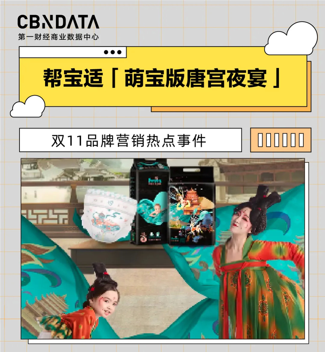 双11期间,帮宝适联动今年大火的“唐宫夜宴”IP,获得自然流量的同时也有创意巧思,“萌娃+唐宫夜宴”的广告形式较有话题度。