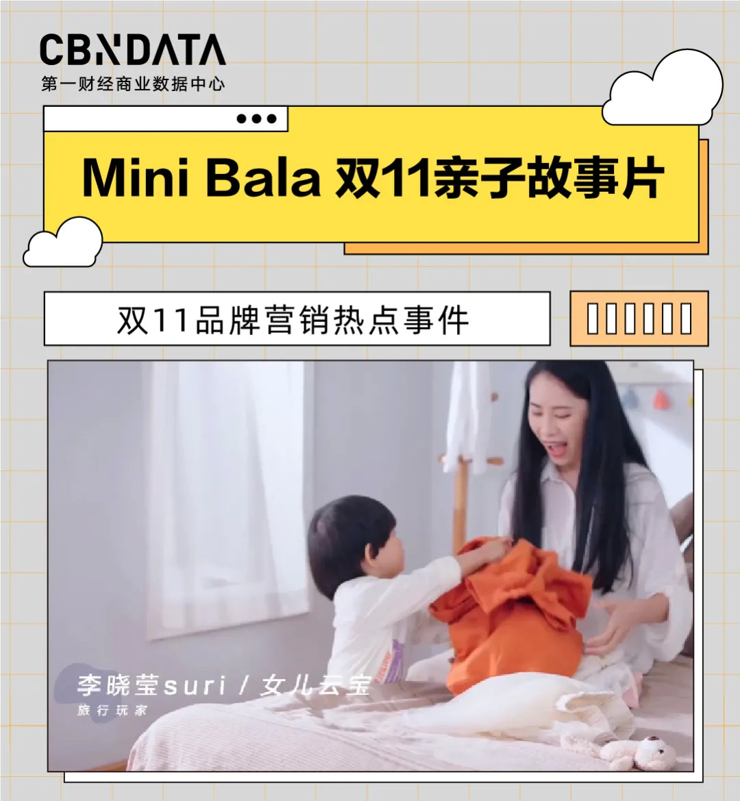 10月25日,森马旗下童装品牌 Mini Bala发布2021双11亲子故事短片,邀请世界街舞冠军肖杰和儿子锁锁、旅行玩家李晓莹和女儿云宝、居家设计师付丹与儿子滚滚、运动达人陈艳和女儿圆圆,共同讲述亲子间的有爱故事。该短片在微博播放量达11万次。
