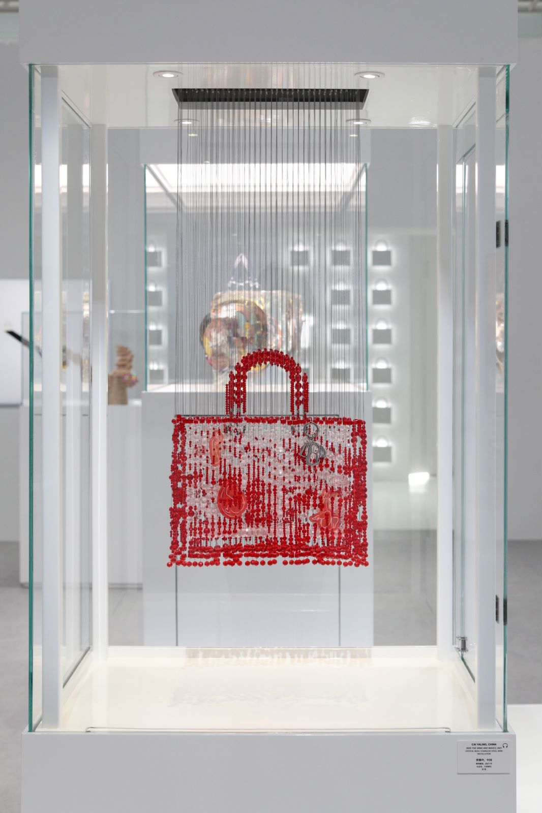 蔡雅玲的《乘风破浪》和张鼎的《无题》是其中东方色彩体现得最为明显的两件。《乘风破浪 》使用象牙雕球来构建出LADY DIOR手袋的廓形,女性身体形态和孕育胎儿造型的片状装饰点缀在两边,流淌而下的鲜红水晶珠帘则条条血脉将二者相连。