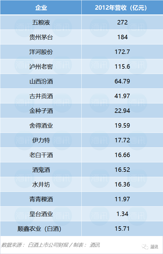 但从规模上来看,“仅次于茅台”这个光环有极强的地域“buff”。2012年,贵州茅台的年营收为184亿元,五粮液272亿元。当年的白酒上市企业中,除了皇台酒业一家,其余均已超过10亿元规模。