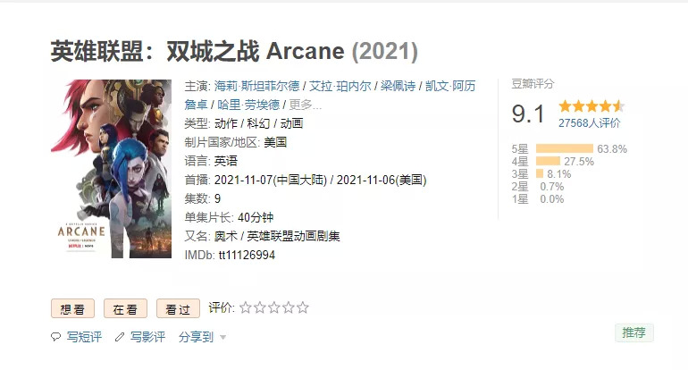 近期,围绕在这个IP身上的最重要的两件事,一件是S11总决赛的舞台上,EDG的夺冠,由此带来了整个中国电竞圈乃至泛娱乐圈的轰动,微博热搜的屠榜、多家央媒和党媒进行报道是最好的证明,一个是首部动画剧集《英雄联盟:双城之战》的播出,且备受好评,在豆瓣其评分高达9.1分。