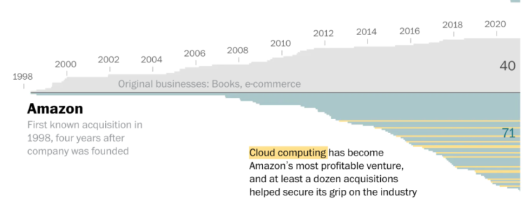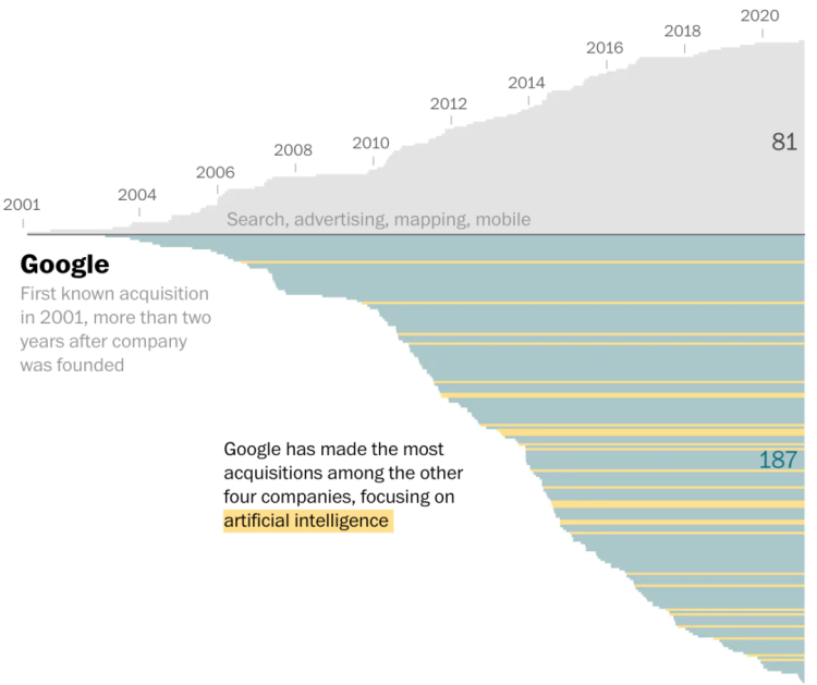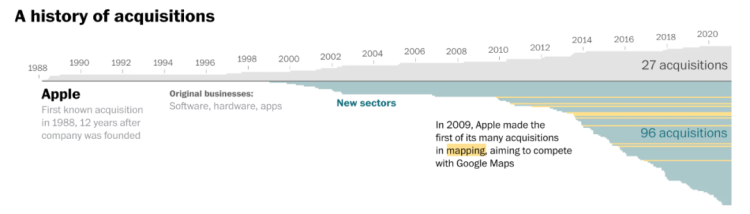 二十年来,以苹果、亚马逊、谷歌、Facebook、微软为代表的头部科技公司,出手收购了硅谷以及整个美国地区数百家中小型创业公司。它们都遵循了类似的模式——先收购原本业务内的公司巩固自己的主导地位,然后长出触角,在新领域进行收购以增加收入来源和包抄竞争对手。