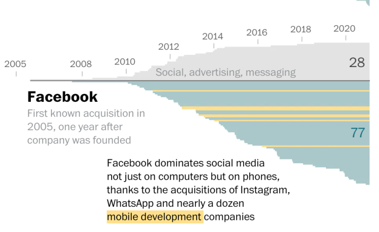 近日,《华盛顿邮报》对苹果、谷歌、亚马逊和Facebook四家科技巨头的收购史做了一次较为全面的统计,为我们直观地展现了近二十年来巨头们在科技领域压制性的扩张。