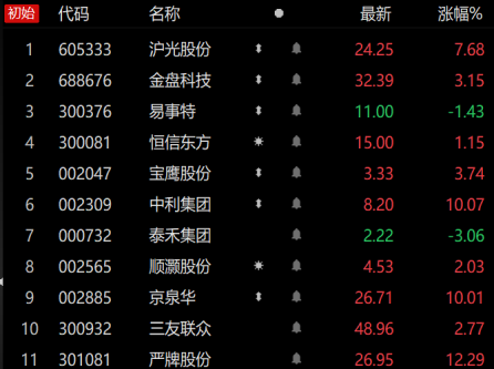 市场焦点股沪光股份(6板)高开7.68%,储能板块金盘科技(科创板2板)高开3.15%、易事特(创业板首板)低开1.43%,元宇宙概念股恒信东方(创业板2板)高开1.15%、宝鹰股份(2板)高开3.74%,光伏股中利集团(2板)竞价涨停,房地产股泰禾集团(2板)低开3.06%,电子烟概念股顺灏股份(2板)高开2.03%,新能源车产业链的京泉华(2板)高开10.01%、三友联众(创业板首板)高开2.77%,次新股严牌股份(创业板首板)高开12.29%。