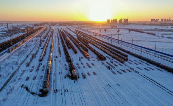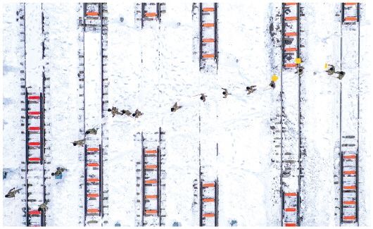 11月11日,在中铁沈阳局集团有限公司通辽站南编组场,武警官兵和铁路工作人员清理积雪(无人机照片)。新华社记者 连振 摄