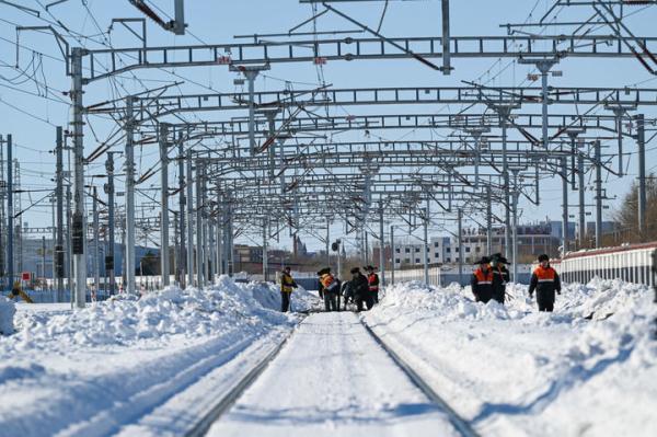 11月11日,在中铁沈阳局集团有限公司通辽站南编组场,武警官兵在清理积雪。新华社记者连振摄