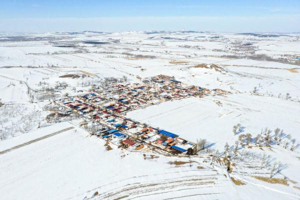 11月13日拍摄的被积雪覆盖的库伦旗先进苏木龙王庙西嘎查(无人机照片)。新华社记者 连振 摄