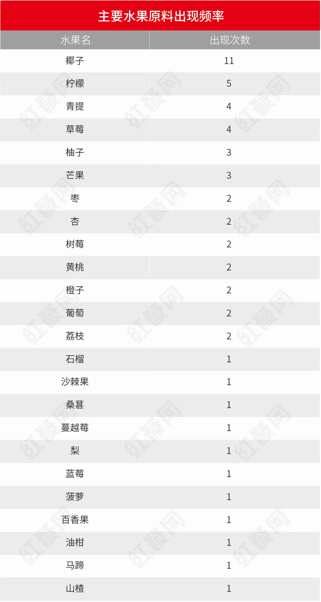 在此次新推的12款咖啡产品中,只有1款是常规的咖啡+牛奶搭配,而最多的是咖啡+水果搭配,达到了8款,诸如椰浆、红柚、柠檬、菠萝等水果都被添加其中。