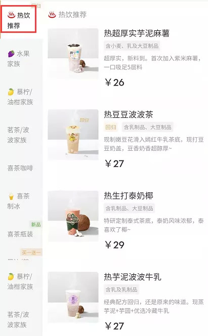 喜茶就专门开辟了热饮系列,提供了16款热饮