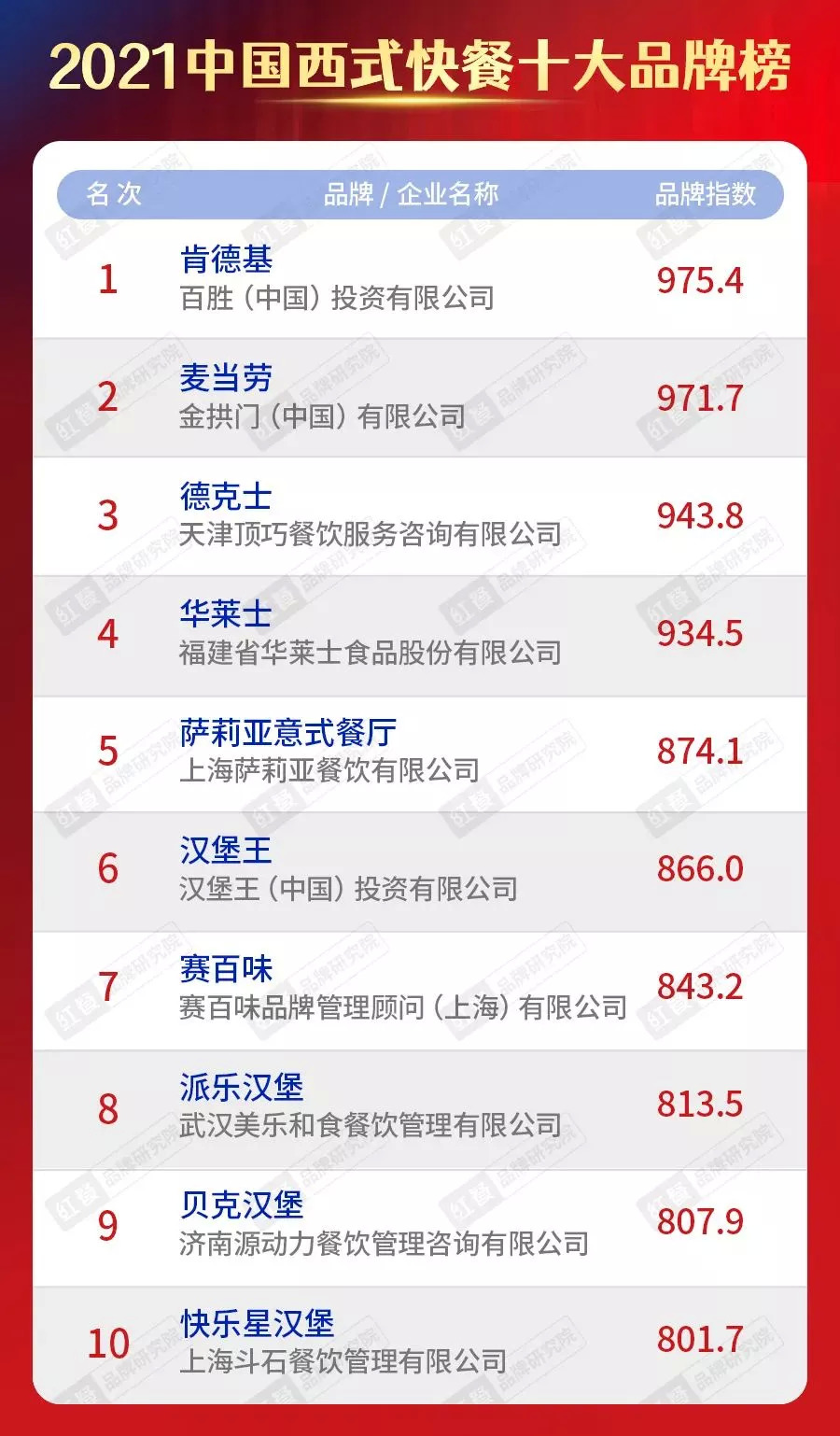 在“2021中国西式快餐十大品牌”榜单中,肯德基、麦当劳两大巨头继续以高指数霸占着榜单的前两名,最早跟进并以脆皮炸鸡,从二三线市场起步打出差异化的德克士拿到第三。