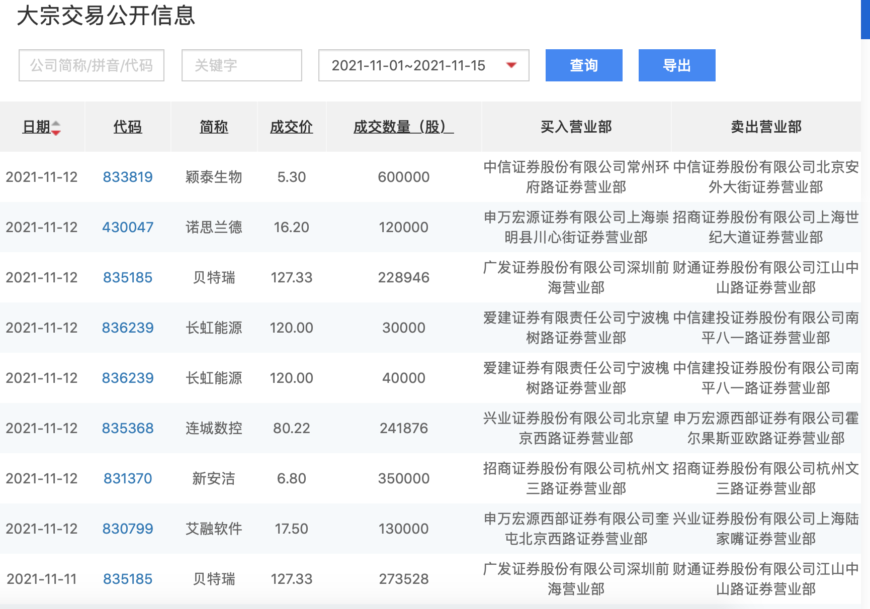 实际上在北交所11月15日正式开市之前,一众标的就显得有些兴奋,11月12日的大宗交易记录了这一切。这其中不乏人气公司长泓能源(836239.BJ)、贝特瑞(835185.BJ)等。