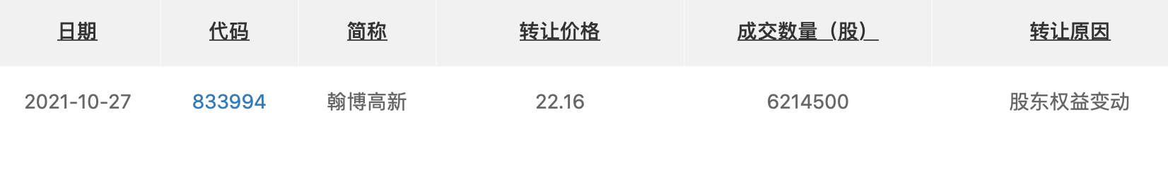 至于有3家公司停牌,则是因为这3家公司已经提交了转板申请。其中,翰博高新(833994.BJ)是在11月4日向深交所提交了转板上市申请文件,拟转入创业板,于11月9日收到受理通知,这也是转板申请获得受理的第一家。而在提交申请前的10月27日,翰博高新还发生了一笔协议转让,当时的转让价为22.16元,成交数量621.45万股。