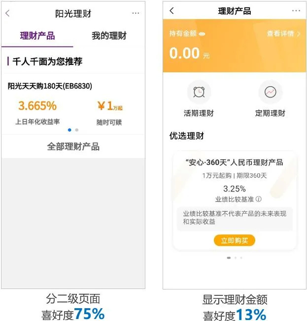 其中理财首页分为在售产品及已买产品二级页面的模式更受用户喜欢,占比为75%。用户喜欢的原因有: