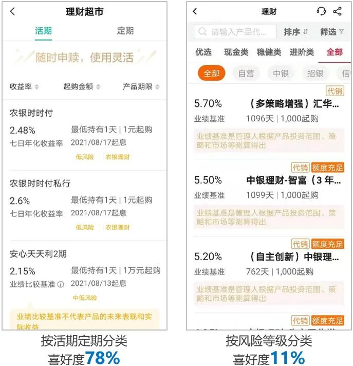 而按风险等级分类的模式喜爱度占比11%,用户认为这种分类方式更直观,“稳健类”、“进阶类”的名称容易理解。