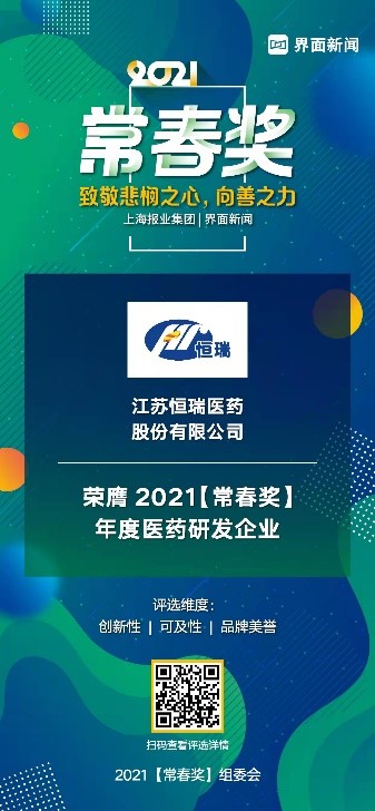 11月16日,上海报业集团l界面新闻揭晓 2021【常春奖】终榜,正式公布了本年度获奖名单。聚焦大健康行业的升级和变化,综合社会各界的意见与建议,来自制药、医疗器械、药品销售、医疗服务、健康管理、健康金融等领域的31家企业夺得了年度大奖。江苏恒瑞医药股份有限公司凭借其高品质的药品研制及推广荣膺年度医药研发企业。
