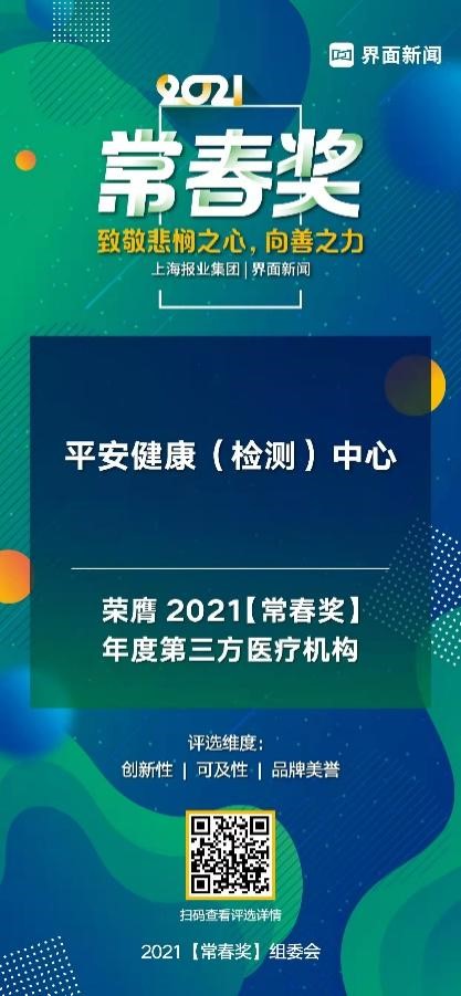 11月16日,上海报业集团l界面新闻揭晓 2021【常春奖】终榜,正式公布了本年度获奖名单。聚焦大健康行业的升级和变化,综合社会各界的意见与建议,来自制药、医疗器械、药品销售、医疗服务、健康管理、健康金融等领域的31家企业夺得了年度大奖。平安健康(检测)中心凭借其专业的第三方医疗服务荣膺年度第三方医疗机构。