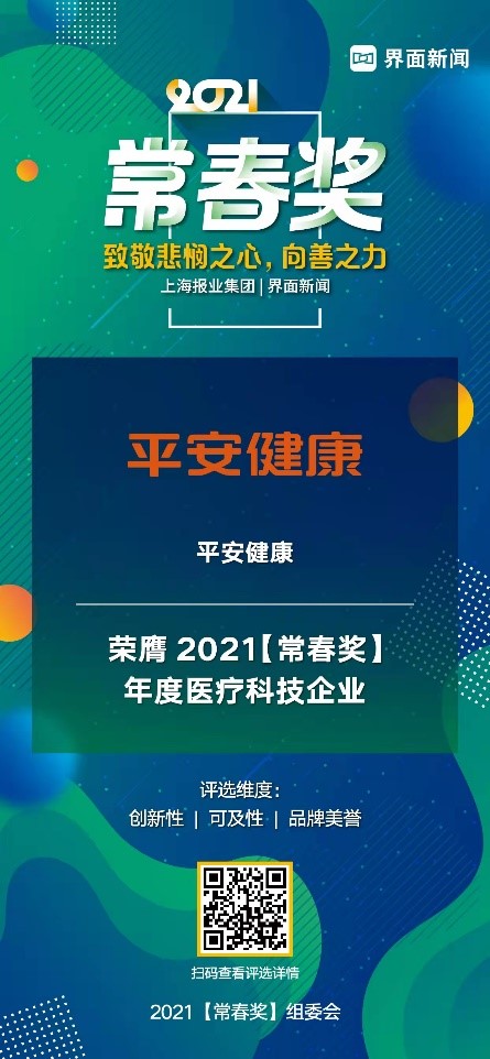 11月16日,上海报业集团l界面新闻揭晓 2021【常春奖】终榜,正式公布了本年度获奖名单。聚焦大健康行业的升级和变化,综合社会各界的意见与建议,来自制药、医疗器械、药品销售、医疗服务、健康管理、健康金融等领域的31家企业夺得了年度大奖。平安健康凭借其强大的医疗和科技能力荣膺年度医疗科技企业。