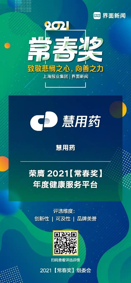 11月16日,上海报业集团l界面新闻揭晓 2021【常春奖】终榜,正式公布了本年度获奖名单。聚焦大健康行业的升级和变化,综合社会各界的意见与建议,来自制药、医疗器械、药品销售、医疗服务、健康管理、健康金融等领域的31家企业夺得了年度大奖。慧用药凭借其高质量的一站式医药服务荣膺年度健康服务平台。