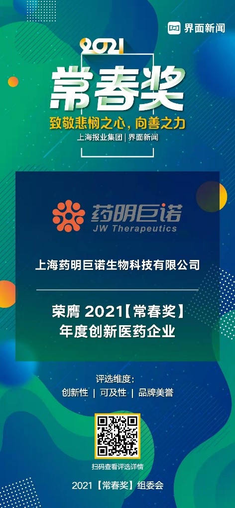 11月16日,上海报业集团l界面新闻揭晓 2021【常春奖】终榜,正式公布了本年度获奖名单。聚焦大健康行业的升级和变化,综合社会各界的意见与建议,来自制药、医疗器械、药品销售、医疗服务、健康管理、健康金融等领域的31家企业夺得了年度大奖。上海药明巨诺生物科技有限公司凭借其重大新药创制荣膺年度创新医药企业。
