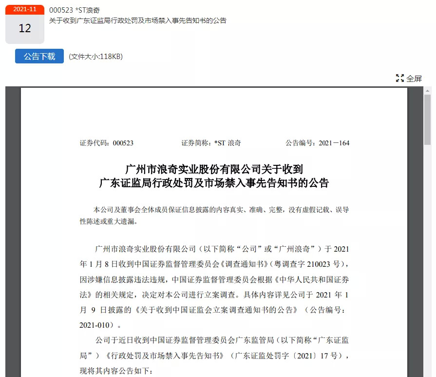 日前,*ST浪奇称收到了《广东证监局行政处罚及市场禁入事先告知书》,由于公司在2018-2019年虚增营收129亿等系列问题,广东证监局对*ST浪奇及7名相关责任人合计处以1405万元的罚款,并对时任董事长傅勇国采取10年证券市场禁入措施,成为日化上市企业中的首个处罚案例。