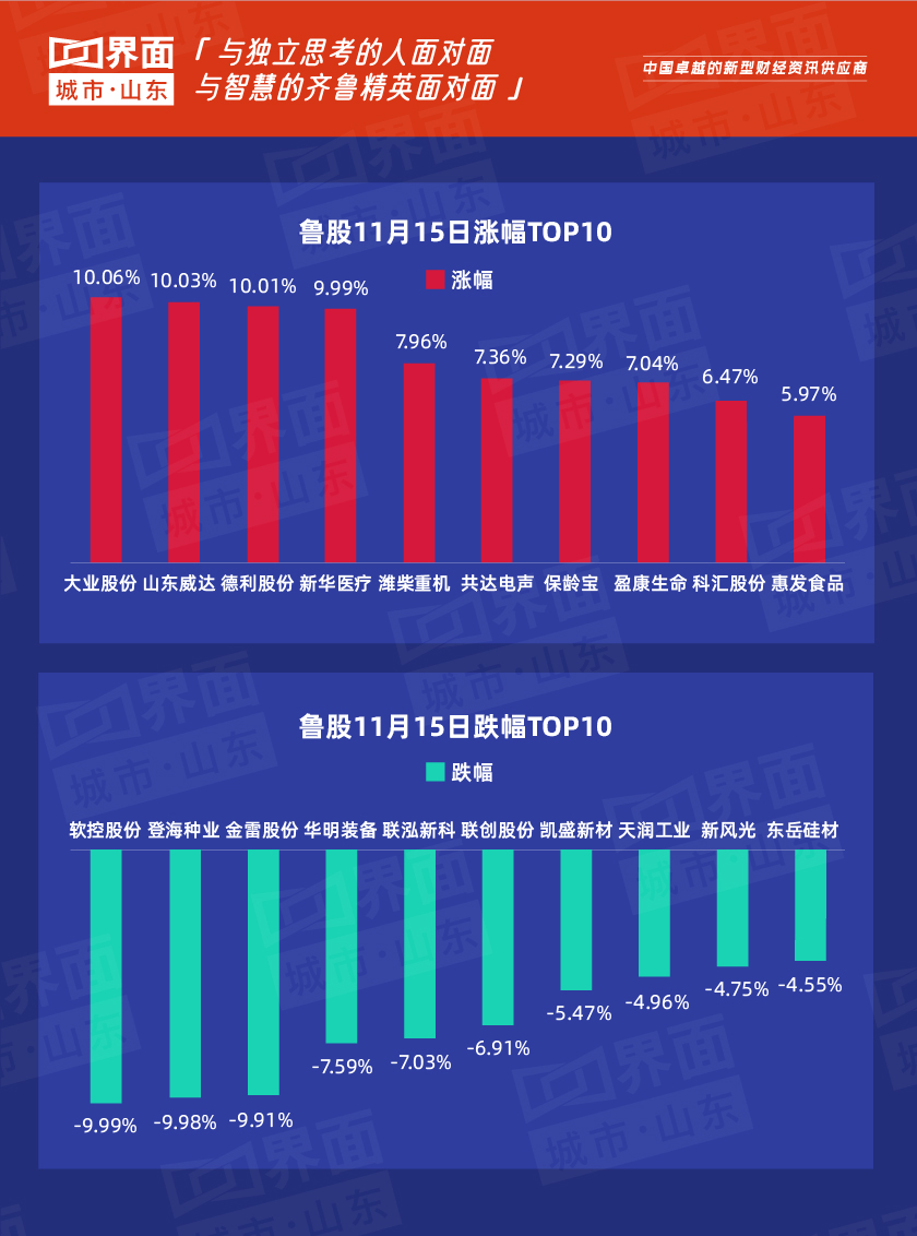 受大盘影响,11月15日,山东177只股上涨,75只股下跌,大业股份领涨。
