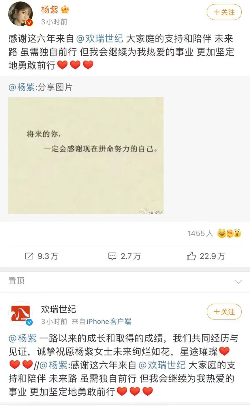 11月15日,演员杨紫转发自己2015年的微博,宣布与欢瑞世纪(000892.SZ)6年合约到期不续约。欢瑞世纪随后也送上祝福:“诚挚祝愿杨紫女士未来绚烂如花,星途璀璨。”