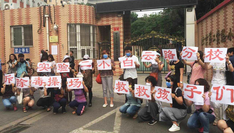 6月3日下午,数十名学生家长齐聚白云路小学门口,举着“排除毒操场,救救孩子们”的牌子呼吁和校方对话,拆除跑道。