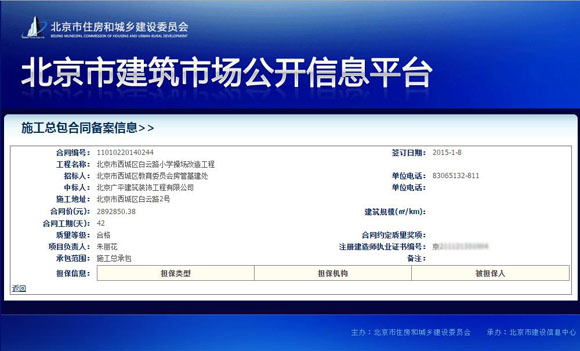 根据北京市建筑市场公开信息平台的信息,白云路小学操场改造工程中标人为北京广平建筑装饰工程有限公司(下称北京广平),签订日期为2015年1月8日,合同价为289.29万元,合同工期为42天,质量等级为合格。