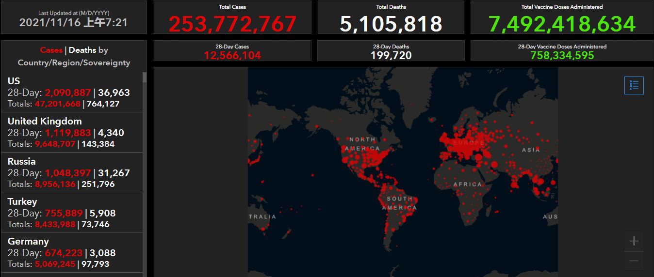 据约翰·霍普金斯大学的疫情追踪数据,截至北京时间11月16日上午8点,全球累计确诊新冠肺炎病例253772767例,累计死亡5105818例,接种疫苗超74.9亿剂次。