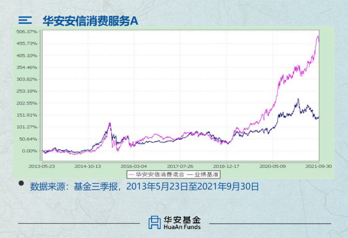 华安安信消费服务成立日2013年5月23日。业绩比较基准为中证消费服务领先指数收益率。“2013年、2014年度- 2020年度、2021年上半年、2021年第三季度”历年业绩(及业绩基准表现)为-4.45%(2.00%)、4.69%(22.10%)、62.96%(23.92%)、-2.69%(-11.85%)、8.10%(25.55%)、-22.28%(-23.03%)、76.75%(41.83%)、88.91%(49.30%)、8.5%(0.9%)、19.03%(-12.90%)。历任基金经理为:陈俏宇(20130523-20150618)、蒋璆(20150616-20160921)、饶晓鹏(20150907-20200525)、王斌(20181031至今)。