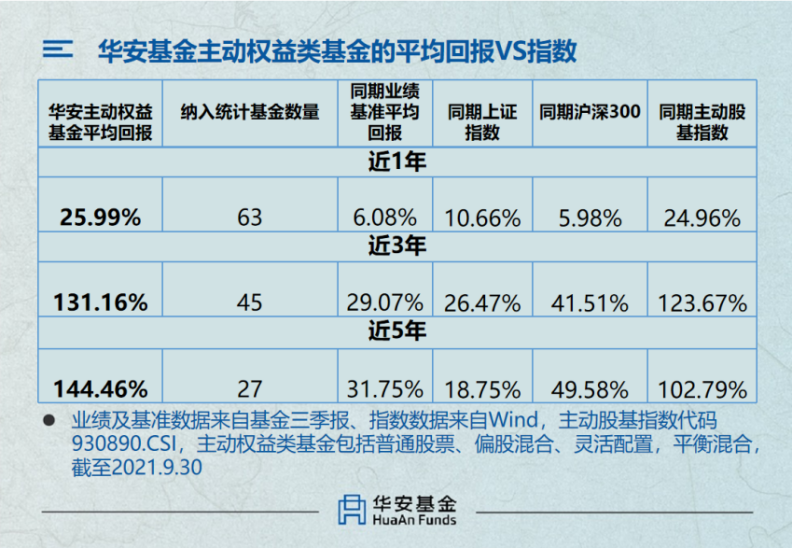 对比可知,近1年、近3年、近5年等不同时间维度,华安基金旗下主动权益产品的平均回报,不仅大幅跑赢同期大盘指数,也超出了主动股基指数。