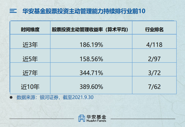 截至三季度末,考察近3年、近5年、近7年、近10年各个时间维度,华安基金股票投资主动管理能力均在同行业中排名前10!
