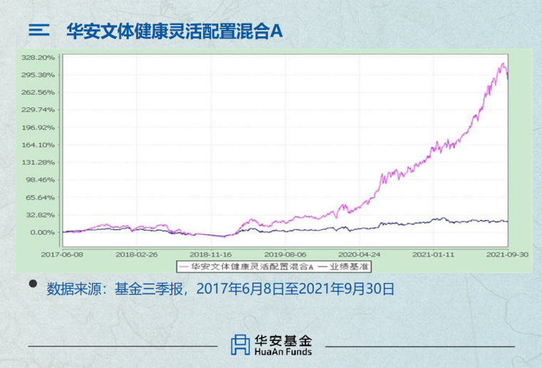 华安文体健康主题成立于2017-06-08。业绩比较基准为中证800指数收益率*50%+中国债券总指数收益率*50%。“2017年度-2020年、2021年上半年、2021年第三季度”历年业绩(及业绩基准表现)为8.90%(5.25%)、-15.98%(-11.71%)、45.90%(16.90%)、87.87%(12.81%)、34.05%(0.98%)、17.46%(-1.55%) 。历任基金经理为:苏圻涵(20170608-20190830)、谢振东(20170608-20191108)、李欣(20170717-20191108)、谢昌旭(20191108-20210315)、刘畅畅(20200108至今)。