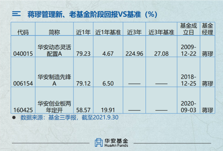 他管理的基金当中,不论华安动态灵活配置、华安制造先锋混合A,还是华安创业板两年定开混合,都取得了优秀回报:
