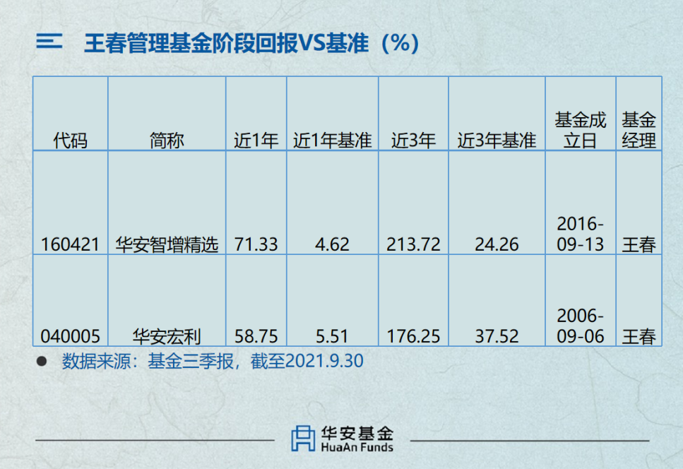 王春今年业绩十分优秀,基金三季报显示,截至2021年9月30日,王春任职的两只基金的近1年、近3年回报,均大幅跑赢基准: